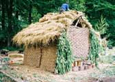 Dafydd's contemporary house had a large South-facing window to collect heat from the Sun, and a turf roof to keep that heat in. The frame was made from square-cut timber from a local D.I.Y. store. Owain's house comprised of walls made from pre-fabricated weaved willow panels, sticks for rafters, and a thatched roof made from split straw bales.